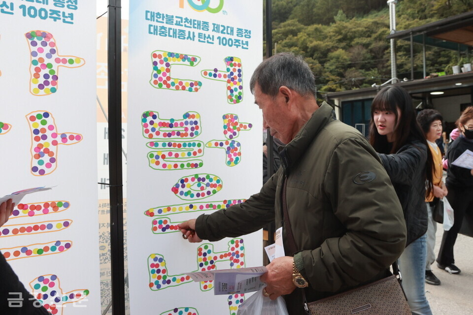 체험부스에서 스티커 붙이기에 참여하는 어르신.